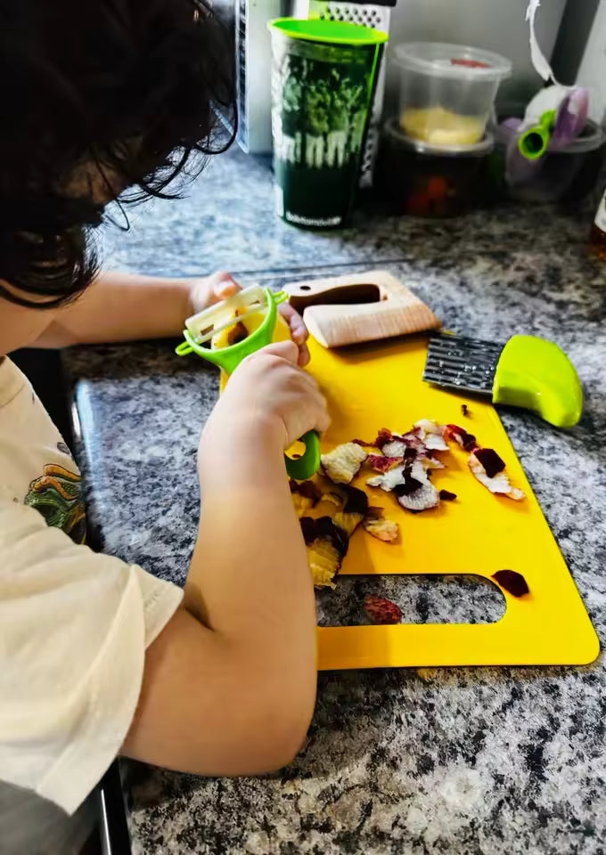 Bezpieczne krojenie owoców i warzyw, rozwijając jednocześnie samodzielność, sprawność manualną i zamiłowanie do gotowania.